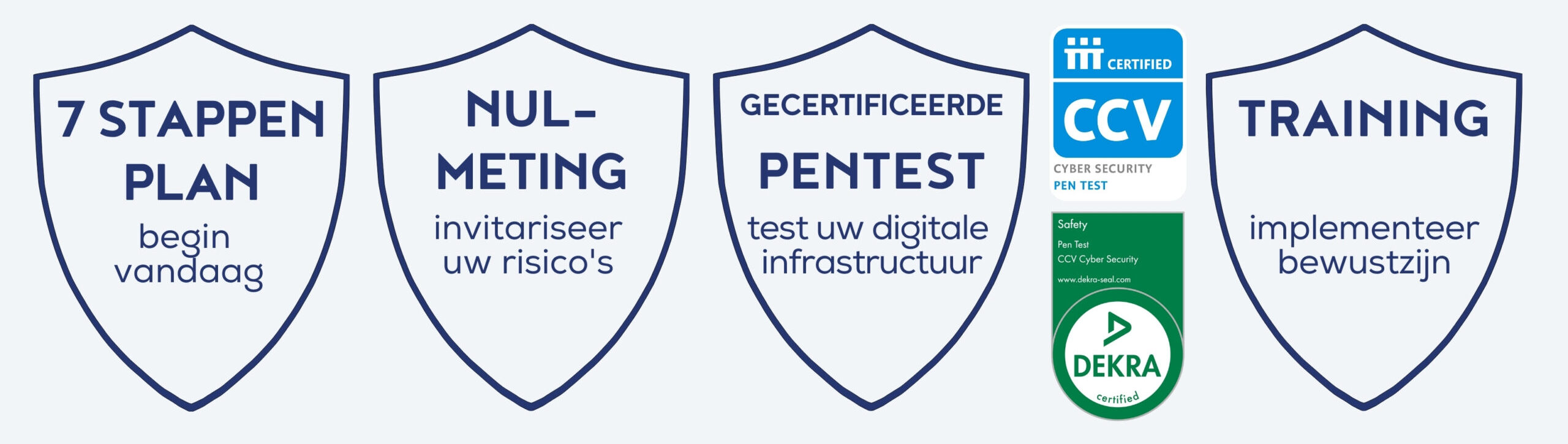 Ons 7-Stappen plan zorgt ervoor dat u op een toegankelijke manier, passend bij uw sector de mogelijkheid krijgt om uw organisatie digitaal weerbaar te maken. Zie hieronder de eerste stappen. Meer informatie of stapsgewijs bekijken wat er mogelijk is voor uw organisatie? Bekijk ze op onze website. Niet elke stap hoeft van toepassing te zijn voor uw organisatie. Natuurlijk is het ook mogelijk om van enkele stappen gebruik te maken. Dit doen we aan de hand van de wensen van uw organisatie en eventuele voorwaarden voor certificering per branche.